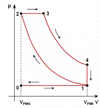 This diagram shows how pressure and volume inside the engine cylinder vary during the four stages of the diesel cycle.