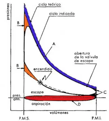 It is therefore necessary to anticipate the ignition of gasoline so that combustion can take place, for the most part, when the piston is in the vicinity of the PMS This produces a rounding of the theoretical line 2-3 of introduction of thermal energy (heat). This yielding of the curve implies a loss of useful work represented by the area B. However, this loss of work results in a quantity that is much smaller than that which would be had without advancing the ignition.