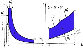 Suivent ensuite deux phases successives, à savoir : l'une de détente adiabatique 4-5, et l'autre de soustraction, à volume constant 5-1, de la quantité de chaleur Q2.
