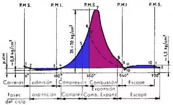 A compressão da carga ocorre como consequência do movimento do pistão na fase 4-6. Considerando que a combustão requer um certo tempo para ser realizada, a fim de alcançar o melhor desenvolvimento da fase útil (combustão e expansão), a ignição é realizada antes que o PMS Point 6 'nos forneça o valor máximo da pressão sem inflamado.